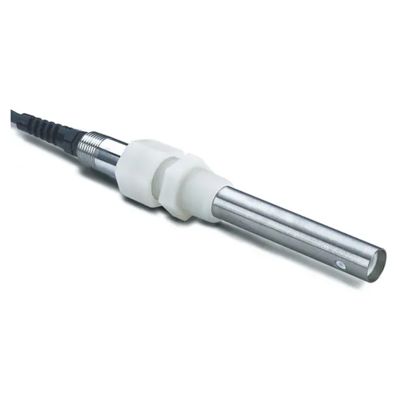 Compression fitting sensors—Feature titanium electrodes and a compression fitting for universal installation with up to 4 inches (102 mm) insertion depth. The ½" or ¾" male NPT compression fittings are offered in PVDF or 316 stainless steel. A longer version of this sensor is available for use with a 316 stainless steel ball valve hardware assembly to insert/retract the sensor from the