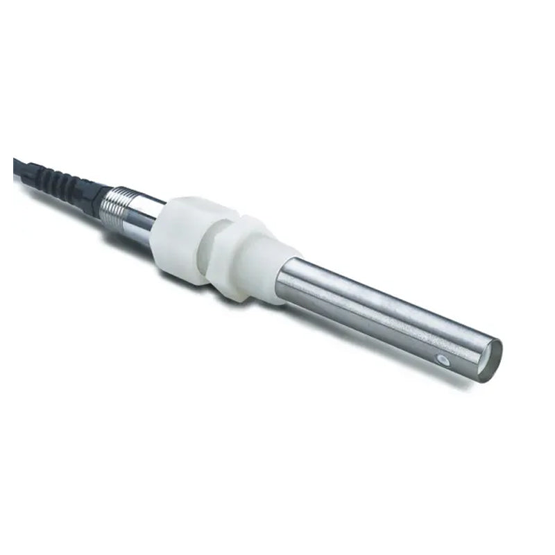 Compression fitting sensors—Feature titanium electrodes and a compression fitting for universal installation with up to 4 inches (102 mm) insertion depth. The 1/2-inch or 3/4-inch male NPT compression fittings are offered in PVDF or 316 stainless steel. A longer version of this sensor is available for use with a 316 stainless steel ball valve hardware assembly to insert/retract the sensor from the process without stopping the flow. The longer version can also be used for insertion through a compression fitting. Maximum insertion depth is 7 inches (178 mm).